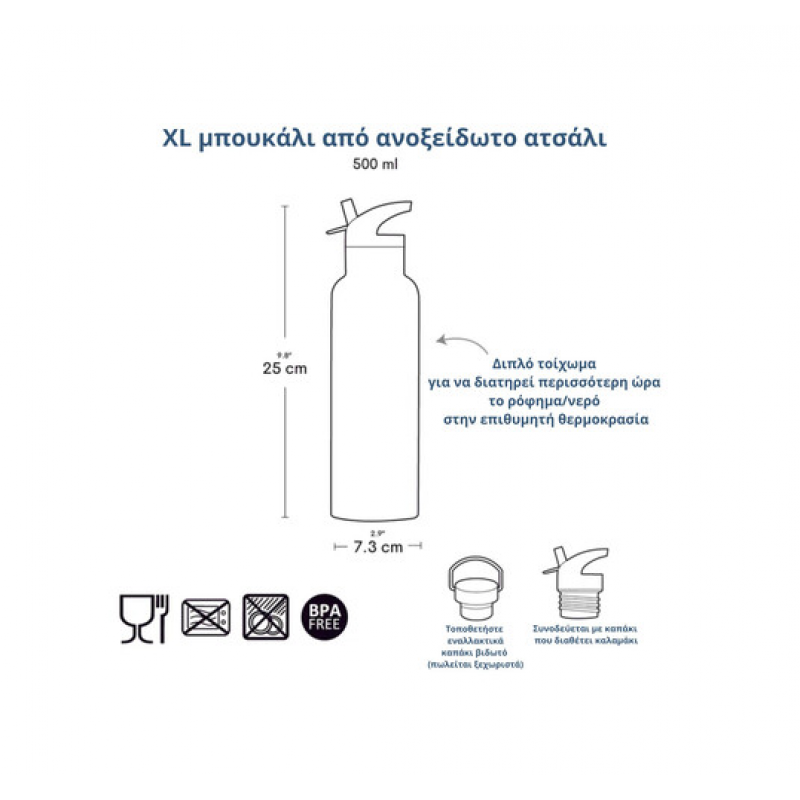 Το μπουκάλι της Little Lovely Company είναι κατασκευασμένο από ανοξείδωτο ατσάλι διπλού τοιχώματος και διατηρεί τα ροφήματα ζεστά ή δροσερά για περισσότερη ώρα.