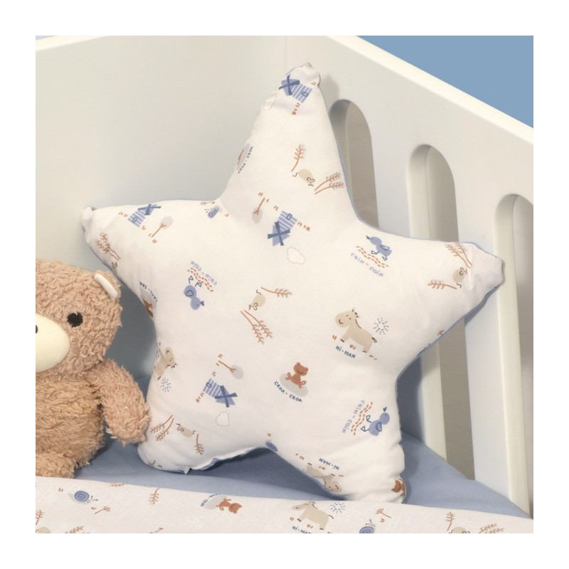μπροστινή πλευρά ζακάρ ζέρσευ , πίσω πλευρά ύφασμα εμπριμέ 100% βαμβάκι με πιστοποίηση Οekotex, γέμιση σιλικονούχος πολυεστέρας συσκευασία νάυλον σακουλάκι.