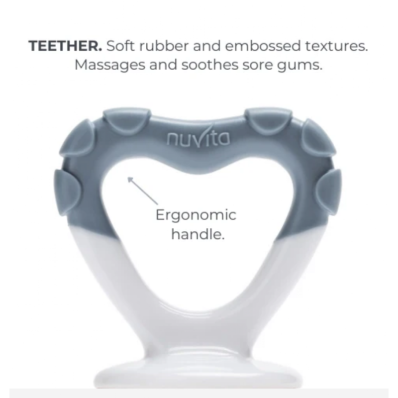 Η εργονομική λαβή του τρώει-φρούτα είναι άνετη για να την κρατάει και το υλικό, από μαλακό καουτσούκ με επιφάνεια με διάφορες ανάγλυφες δομές, μασά και προσφέρει ανακούφιση στα ερεθισμένα ούλα.