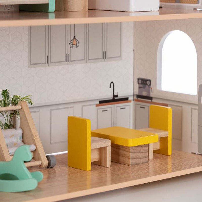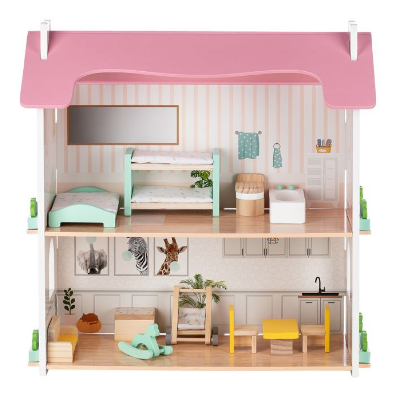 Περιλαμβάνονται αξεσουάρ: τραπέζι, 2 καρέκλες, καναπές, κουτί παιχνιδιών, καρότσι, κουνιστό άλογο, κρεβάτι, κουκέτα, μπάνιο, τουαλέτα.