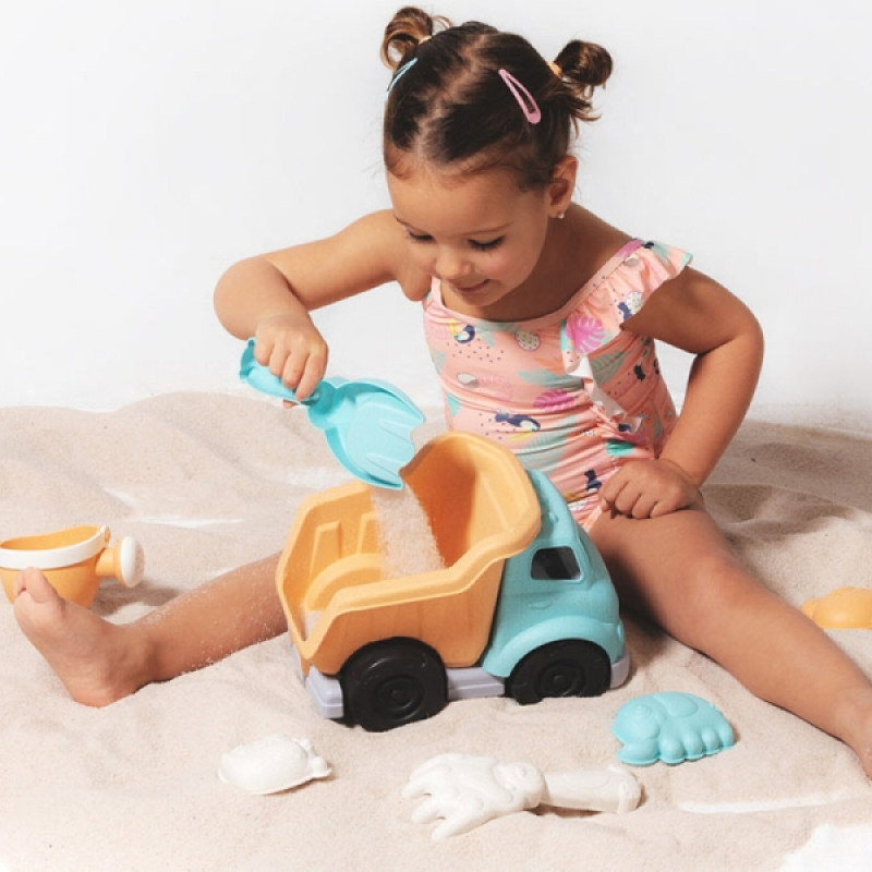 Αυτό το σετ παραλίας έχει ένα φορτηγό για να μαζεύει άμμο και να τη μεταφέρει στο ρυμουλκούμενο του.