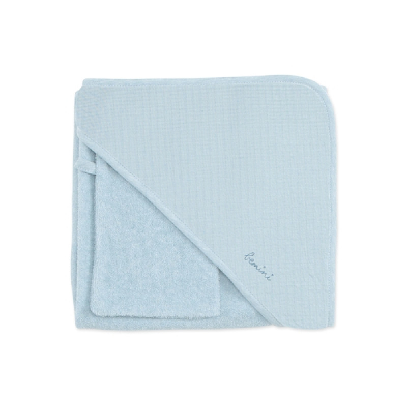 Η κουκούλα κρατά το κεφαλάκι άνετο και ζεστό. Η πετσέτα μπάνιου και το ασορτί γάντι είναι απαραίτητα από τη γέννηση και μετά.