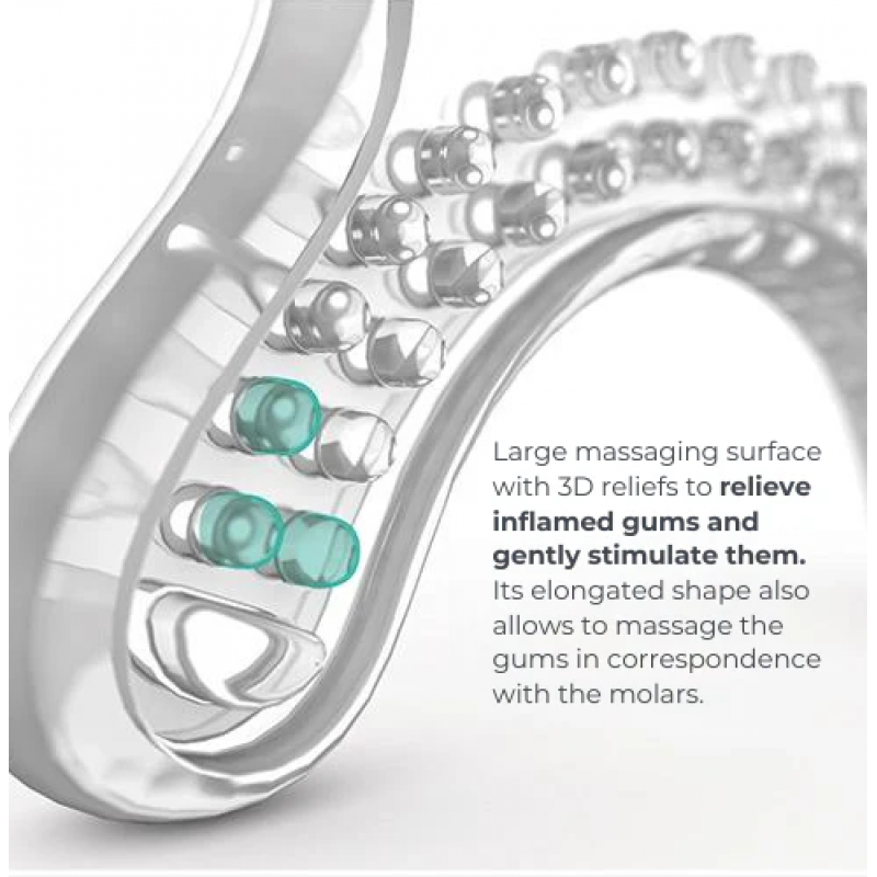 - Μεγάλη επιφάνεια μασάζ με τρισδιάστατο ανάγλυφο, ιδανική για την καταπράυνση των φλεγμονωδών ούλων και την απαλή διέγερσή τους.