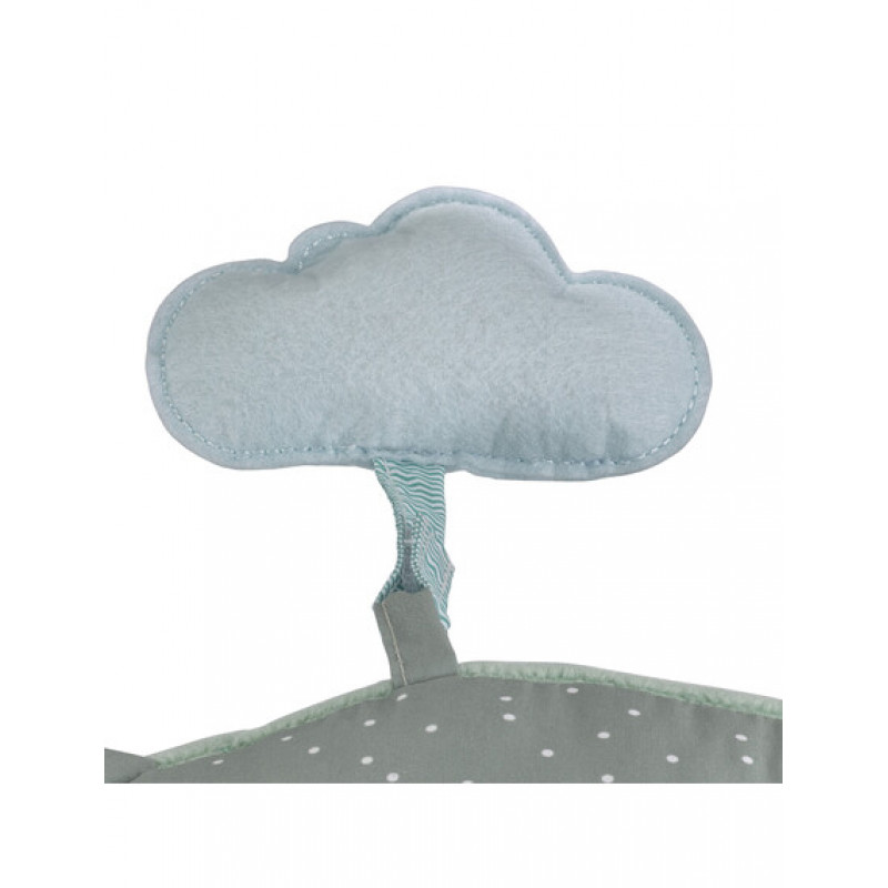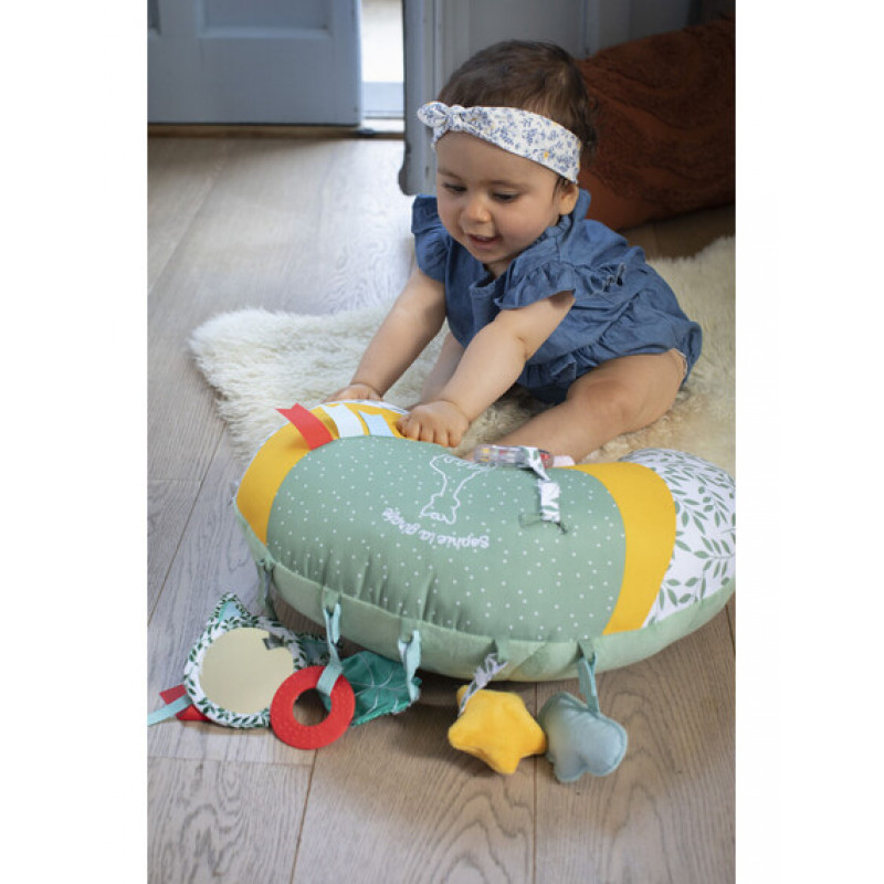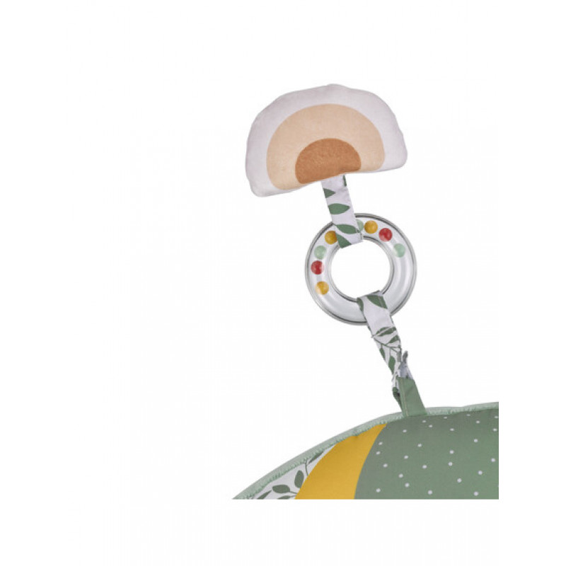 Γύρω από το μαξιλάρι, υπάρχουν κρεμαστά παιχνιδάκια που θα το διασκεδάζουν και θα του προσφέρουν δημιουργική απασχόληση. Ένα κρίκο με μπιλίτσες που κάνει τον ήχο της κουδουνίστρας, έναν καθρέφτη για να βλέπει την δική του αντανάκλαση και να εξοικειώνεται με την δική του εικόνα, ένα μασητικό για να απαλύνει τα πονεμένα του ούλα και μια υφασμάτινη μπαλίτσα.