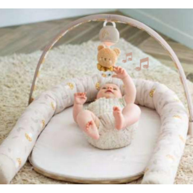 Λειτουργία Γυμναστηρίου.Ανοίγει σε ένα διεγερτικό γυμναστήριο με αψίδα και μουσικό παιχνίδι με φωτάκι για να ενθαρρύνει το άγγιγμα, το κύλισμα και την αισθητηριακή ανακάλυψη.