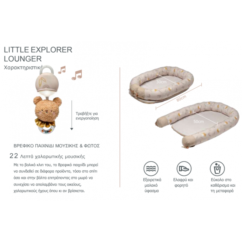 Παρουσιάζουμε την φωλιά Little Explorer – ένα απαραίτητο 2 σε 1 για μωρά που μεγαλώνει μαζί με το μωρό! Αυτή η ευέλικτη, απαλή, premium φωλιά με αποσπώμενη καμάρα μαζί με κρεμαστό μουσικό με εναλλασσόμενο φως 22 λεπτών κατασκευασμένο για να ηρεμεί τα νεογέννητα. Καθώς το μωρό μεγαλώνει, απλώς ξεδιπλώστε τους βραχίονες από αφρώδες υλικό για να τη μετατρέψετε σε ένα χαλαρωτικό γυμναστήριο παιχνιδιού. Προσφέρει μακροπρόθεσμη αξία - από άνετη θέση ανάπαυσης του μωρού, έως ενεργό χρόνο παιχνιδιού!