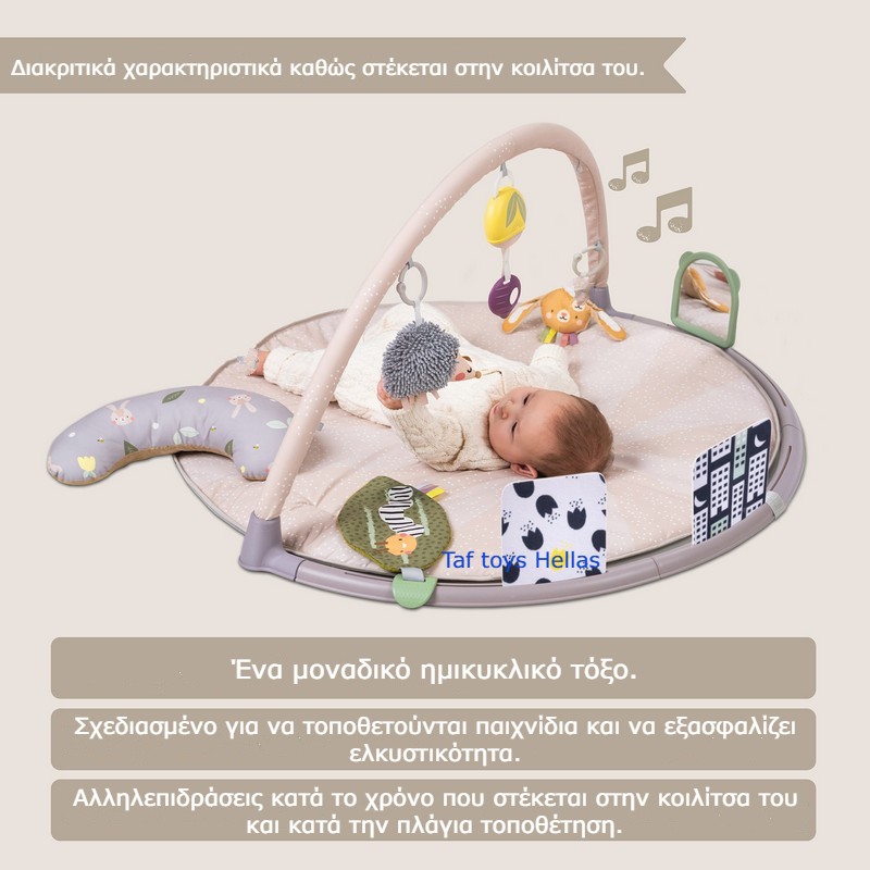 Καλώς ήρθατε στον κόσμο της Taf Toys. Σας παρουσιάζουμε το νέο μας βρεφικό μας γυμναστήριο, ειδικά σχεδιασμένο για τρία στάδια ανάπτυξης εξασφαλίζει την άνεση του μωρού σας, το ενθαρρύνει στην εξερεύνηση, προωθεί τη δύναμη, τον συντονισμό και την αισθητηριακή ανάπτυξη, Η μοναδική καμάρα δαπέδου που διαθέτη, χωρίς ραφή, έχει σχεδιαστεί για να κρατά εύκολα κάρτες διπλής όψης, έναν ασφαλή καθρέφτη από σιλικόνη, ένα φύλλο που τσακίζει και παιχνιδιάρικες κορδέλες. Ιδανικό τόξο για την τακτοποίηση και τοποθέτηση των παιχνιδιών κατά τη διάρκεια της πλάγιας τοποθέτησης του μωρού σας και των ασκήσεων του καθώς στέκεται στην κοιλίτσα του. Αποτελεί την καλύτερη εξερεύνηση για ορόσημα πριν από το μπουσούλημα και το κάθισμα, προάγοντας τη δύναμη, τον συντονισμό και την αισθητηριακή ανάπτυξη. Το γυμναστήριο διαθέτει ένα βελούδινο στρώμα με επένδυση και ένα μαξιλάρι εκγύμνασης για την ώρα που στέκεται στην κοιλίτσα του. Μια ποικιλία αισθητηριακών παιχνιδιών , όπως ένας σκαντζόχοιρος, ένα παντζάρι που κροταλίζει, ένα μουσικό παιχνίδι που ενεργοποιείται με έλξη και προσφέρει 20 λεπτά μελωδιών και απαλό φως και ένα φύλλο που τσαλακώνει. Αυτά τα παιχνίδια έχουν σχεδιαστεί για να διεγείρουν τις αισθήσεις του μωρού σας και να το διασκεδάζουν. Όλα σχεδιασμένα για να εμπλουτίζουν τις ακουστικές και απτικές αισθήσεις του μωρού,προάγοντας τη δύναμη, τον συντονισμό και την αισθητηριακή ανάπτυξη. Το παιδικό γυμναστήριο έχει σχεδιαστεί για τρία στάδια ανάπτυξης: Πλαϊνή τοποθέτηση: Η πλάτη του μωρού αγκαλιάζει απαλά από το υποστηρικτικό μαξιλάρι. Καθώς στέκεται στην κοιλίτσα του: Το μαξιλάρι διευκολύνει την άνετη τοποθέτηση του μωρού, με παιχνίδια τοποθετημένα στρατηγικά στο μοναδικό τόξο μπροστά και δίπλα από το μωρό. Ξαπλωμένο στην πλάτη του: Κοιτώντας και τραβώντας τα κρεμαστά παιχνίδια αιχμαλωτίζει την προσοχή του μωρού, προσφέροντας οπτική διέγερση. Αυτό διασφαλίζει ότι το γυμναστήριο μεγαλώνει μαζί με το μωρό σας, παρέχοντας διασκεδαστικά και αναπτυξιακά οφέλη σε κάθε στάδιο.