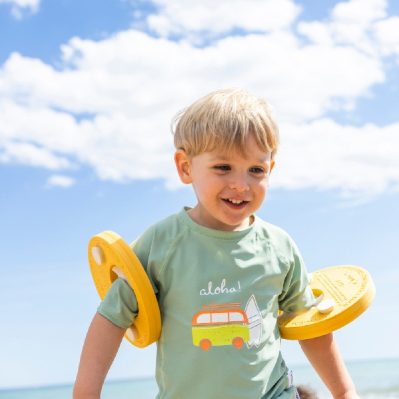 Αυτό το μπλουζάκι με προστασία UV UPF 50+ θα προστατεύσει το μικρό σας τις ηλιόλουστες μέρες στην παραλία και στην πισίνα. Το ύφασμά του είναι πολύ απαλό και εύκαμπτο, σέβεται εξαιρετικά το ευαίσθητο δέρμα του μωρού σας. Έχει επίσης υψηλό επίπεδο αντοχής στο χλώριο, ιδανικό για χρήση στην πισίνα!
