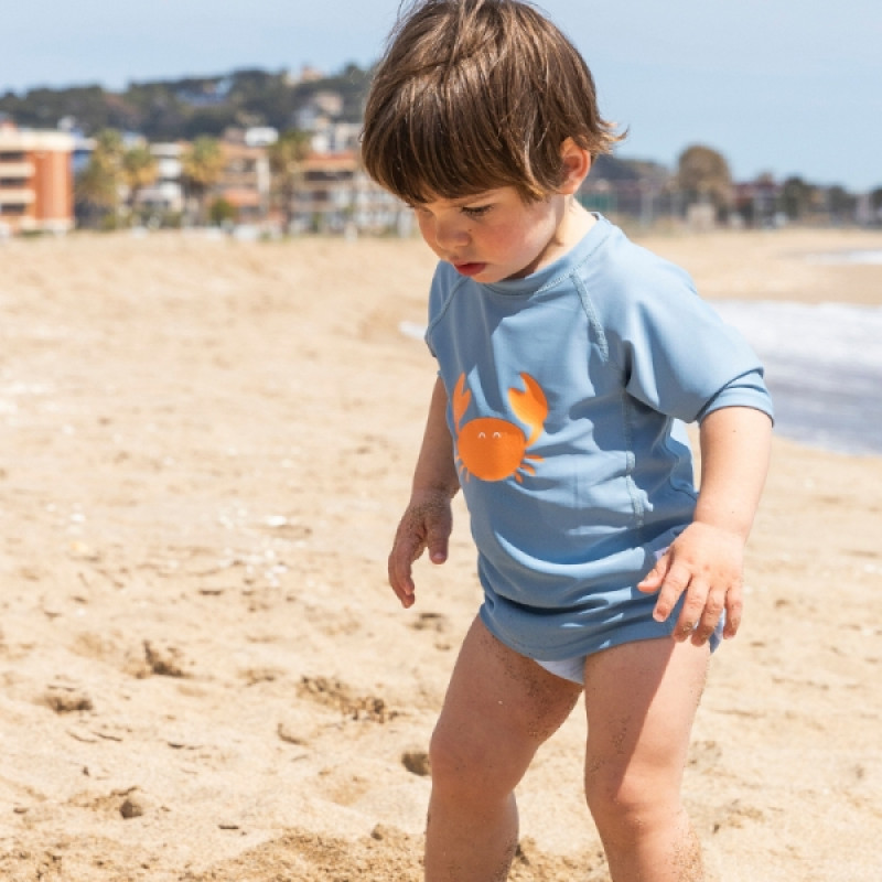 Αυτό το μπλουζάκι με προστασία UV UPF 50+ θα προστατεύσει το μικρό σας τις ηλιόλουστες μέρες στην παραλία και στην πισίνα. Το ύφασμά του είναι πολύ απαλό και εύκαμπτο, σέβεται εξαιρετικά το ευαίσθητο δέρμα του μωρού σας. Έχει επίσης υψηλό επίπεδο αντοχής στο χλώριο, ιδανικό για χρήση στην πισίνα!