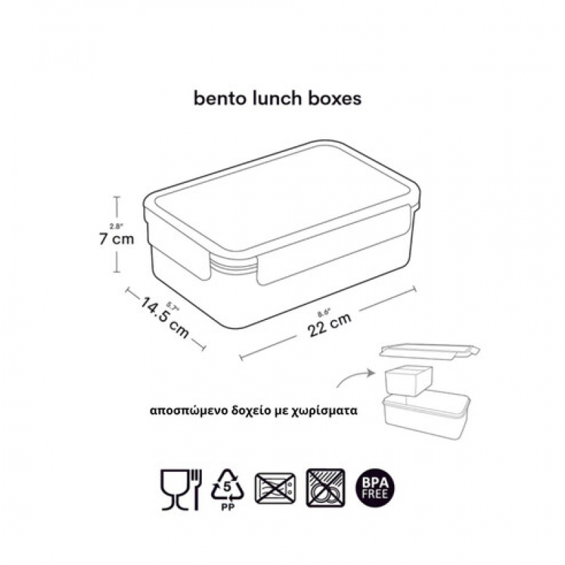 Αρκετά μεγάλο για να παίρνει τη σωστή ποσότητα φαγητού, αλλά αρκετά μικρό για να χωράει σε κάθε τσάντα, παιδική ή ενήλικα. Με αποσπώμενο δίσκο με χωρίσματα, που βοηθά την καλύτερη οργάνωση του φαγητού και των σνακ και να φτάνουν στον προορισμό τους όπως πρέπει.