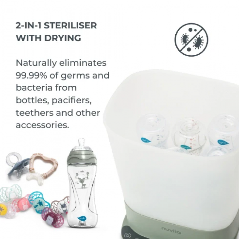 Ο αποστειρωτής SteriDry εξαλείφει το 99,99% των μικροβίων και βακτηρίων με φυσικό τρόπο μέσω αποστείρωσης ατμού υψηλής θερμοκρασίας, η οποία εξασφαλίζει βαθύ καθαρισμό των μπιμπερό, θηλών, πιπίλων, δακτύλων οδοντοφυΐας και άλλων αξεσουάρ, όπως για παράδειγμα τα αποστειρώσιμα μέρη του θηλαστικού.