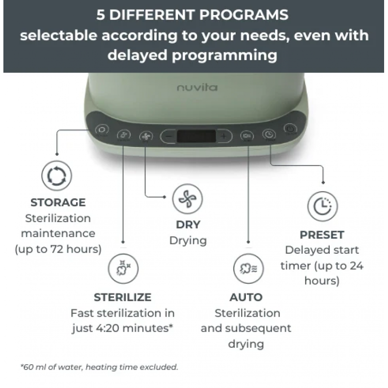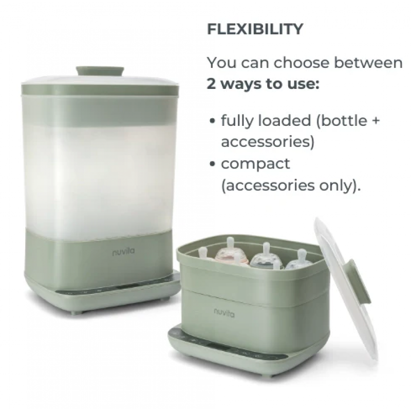 Ανάλογα με την ποσότητα και τον τύπο των αντικειμένων που πρέπει να αποστειρωθούν, μπορείτε να χρησιμοποιήσετε τον αποστειρωτή Nuvita SteriDry επιλέγοντας μεταξύ 2 λειτουργιών: πλήρης φόρτωση (μπιμπερό + αξεσουάρ) ή συμπαγής (μόνο αξεσουάρ).
