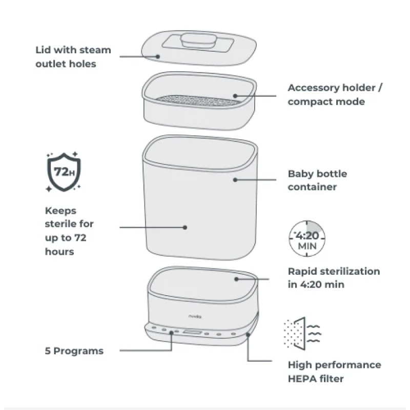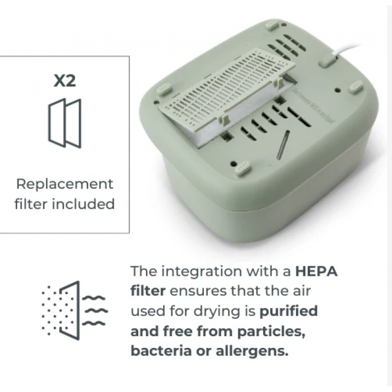 Η ξήρανση πραγματοποιείται εσωτερικά με καθαρισμένο αέρα μέσω φίλτρου HEPA, το οποίο αφαιρεί τα ρυπαντικά σωματίδια, τα βακτήρια και τα αλλεργιογόνα. Αυτό εξασφαλίζει αναμφίβολα αποστείρωση σε ανώτερο επίπεδο για την προστασία της υγείας του μωρού.