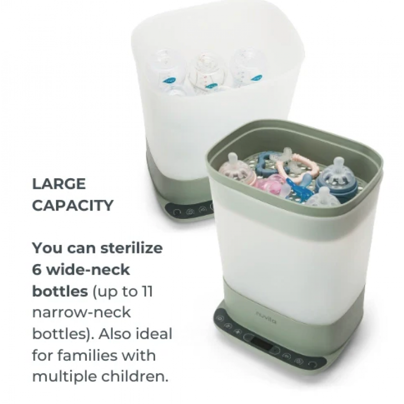 Στο τέλος κάθε κύκλου, η συσκευή απενεργοποιείται αυτόματα, εξασφαλίζοντας τη μέγιστη ασφάλεια και περιορίζοντας την κατανάλωση ενέργειας.Σχεδιασμένος για να περιέχει και να αποστειρώνει ταυτόχρονα έως και 6 μπιμπερό με φαρδύ λαιμό ή 11 με στενό λαιμό, ο αποστειρωτής SteriDry είναι ιδανικός και για οικογένειες με περισσότερα από ένα παιδιά.