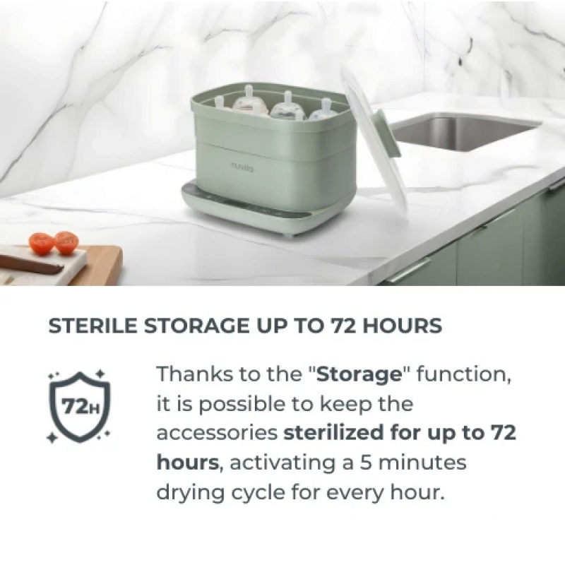 Χάρη στη λειτουργία "Storage", μπορείτε να διατηρείτε τα αξεσουάρ πάντα αποστειρωμένα και έτοιμα προς χρήση για έως 72 ώρες. Αυτό επιτυγχάνεται καθώς κάθε ώρα εκτελείται αυτόματα ένας κύκλος ξήρανσης 5 λεπτών, ο οποίος αποτρέπει την υπολειπόμενη υγρασία και προλαμβάνει τον κίνδυνο επαναμόλυνσης.
