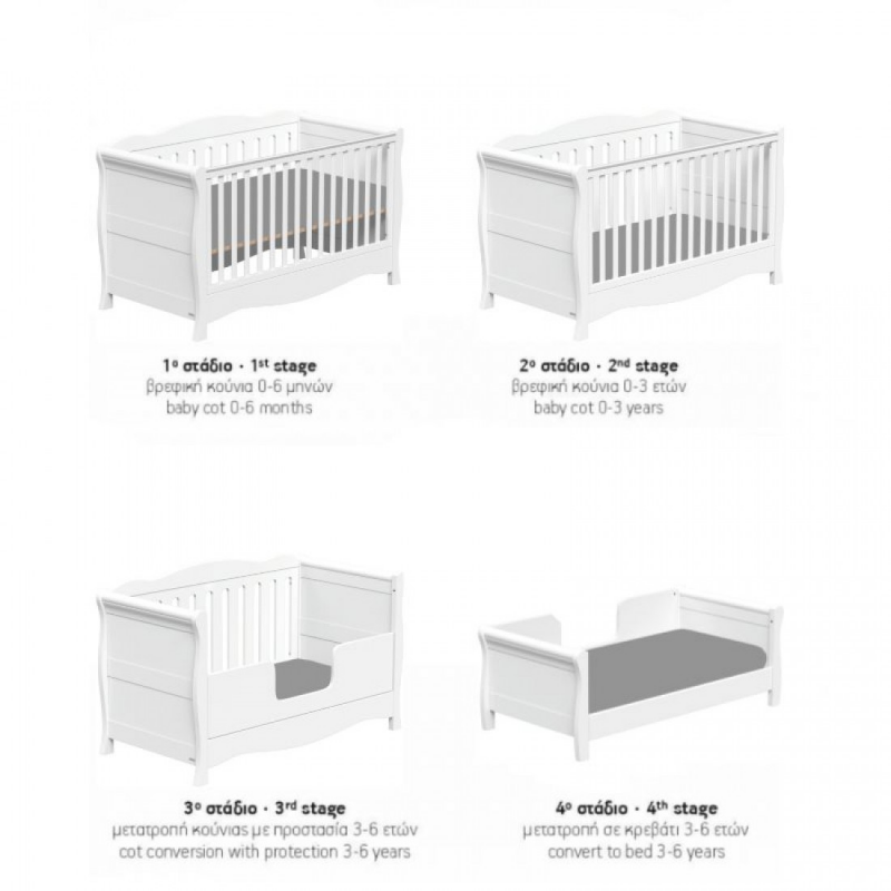 - Η διάσταση της κούνιας είναι 156 x 78 x 93 cm, ενώ μετά τη μετατροπή της σε κρεβατάκι, οι διαστάσεις παραμένουν ίδιες