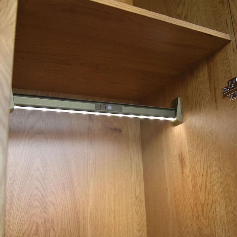Διαθέτει, δυο μεγάλες πόρτες, τέσσερα μεγάλα ράφια και μία βέργα κρέμασης με φώτα Led τα οποία ανάβουν όταν ανοίγουμε την πόρτα ώστε να μας διευκολύνει να βρίσκουμε ευκολότερα  τα ρουχαλάκια  του παιδιού.